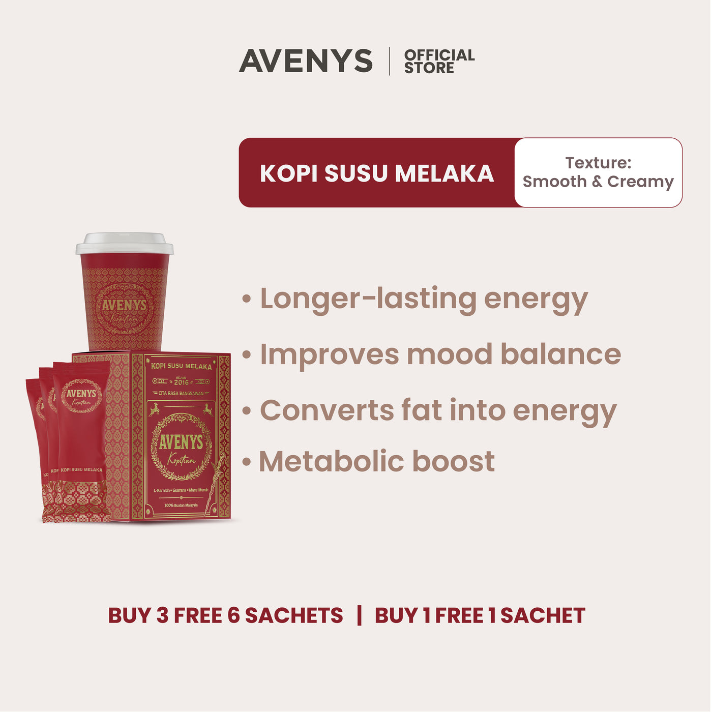Non-Dairy Creamer, Coffee Powder, Sugar, Maltodextrin, L-Carnitine, Guarana Extract, Red Maca Extract, Flavouring, Stabilizer, Sweetener